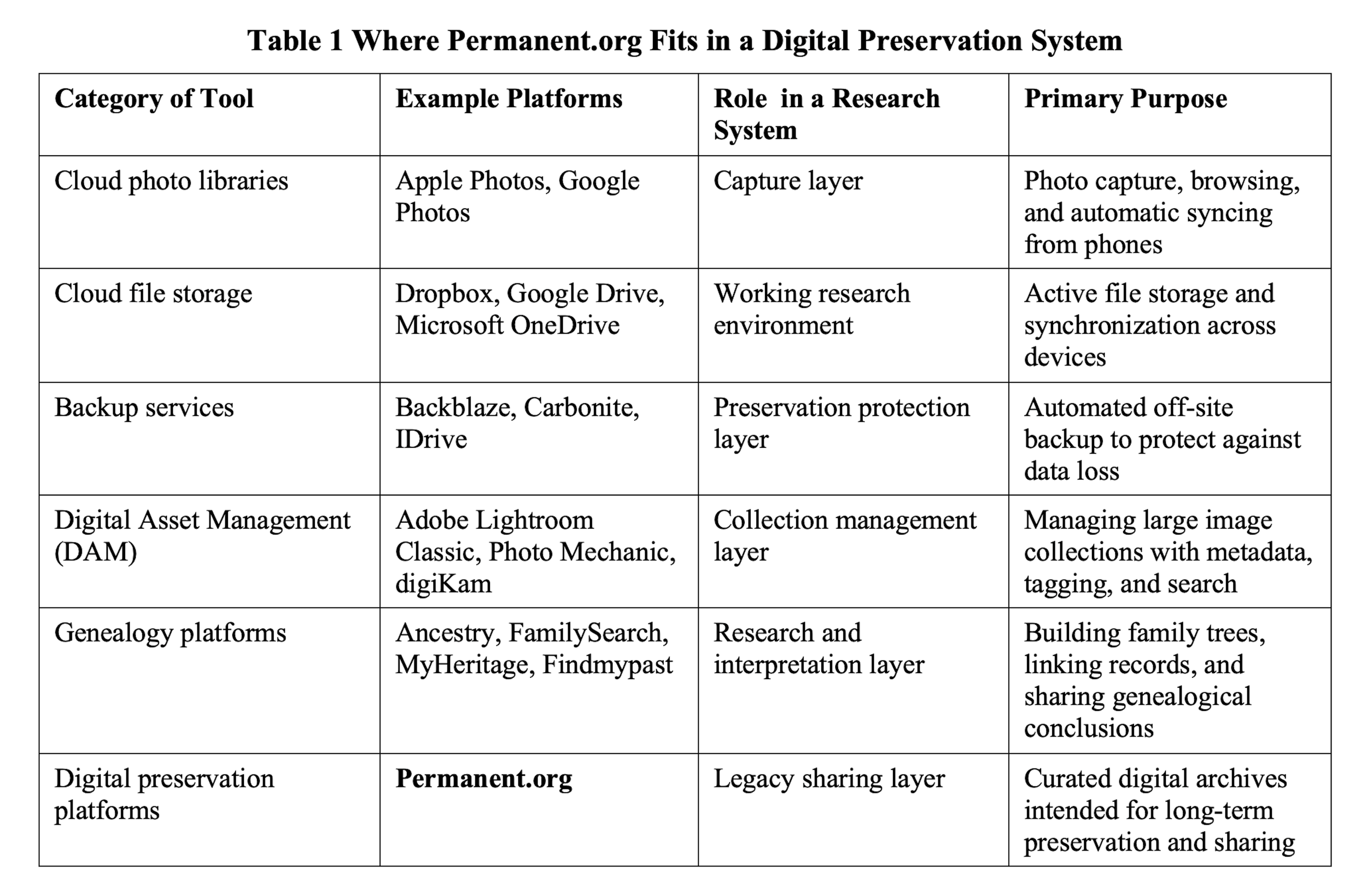 The following table (Table 1) illustrates where Permanent.org fits relative to other commonly used tools in a digital preservation system.